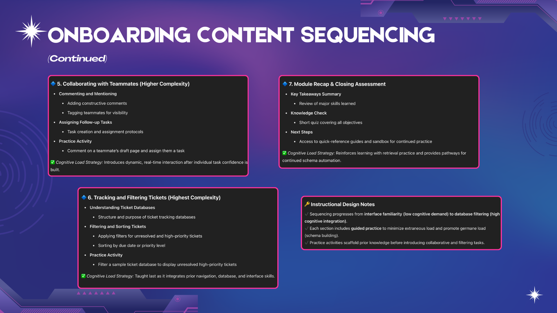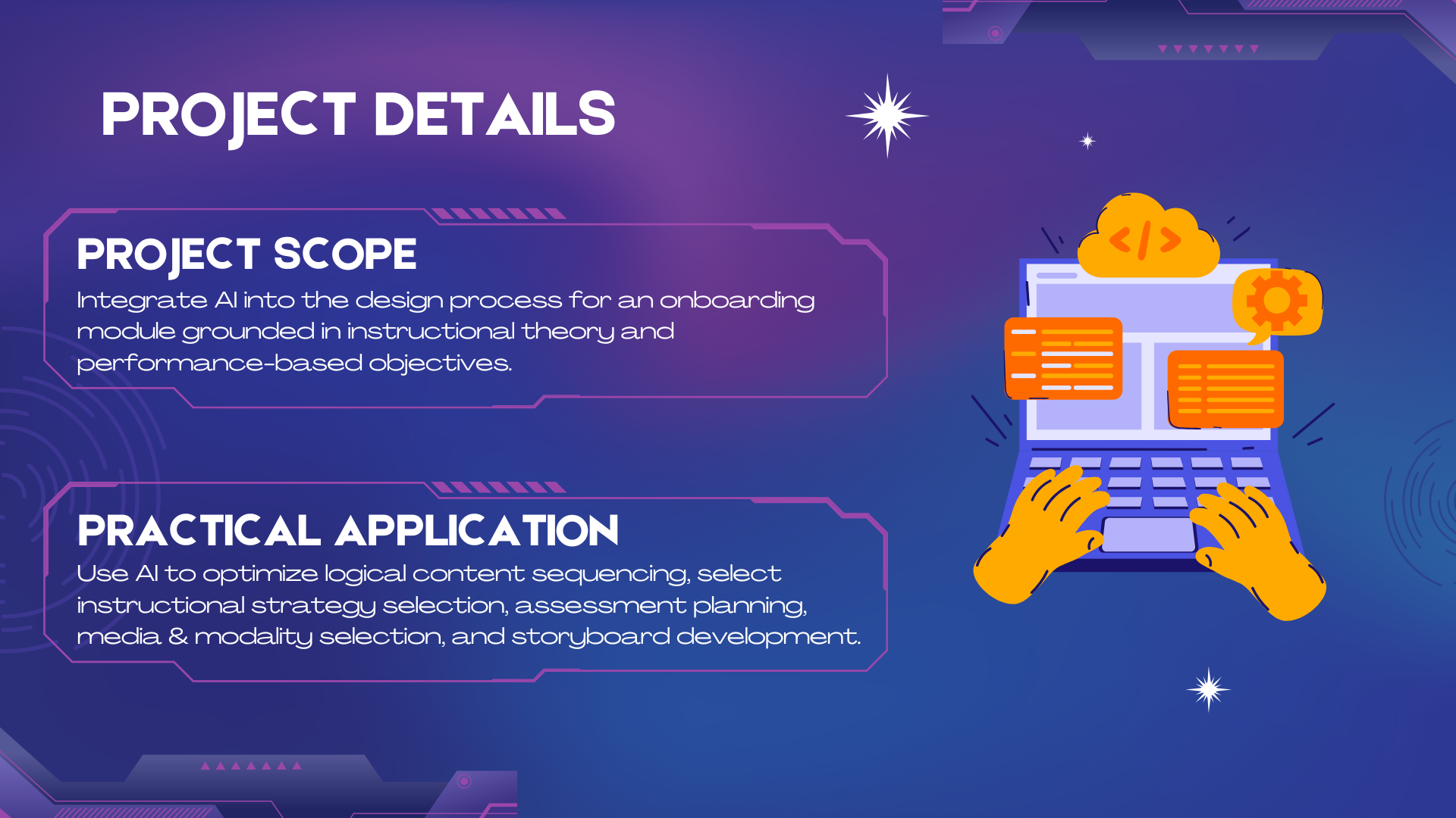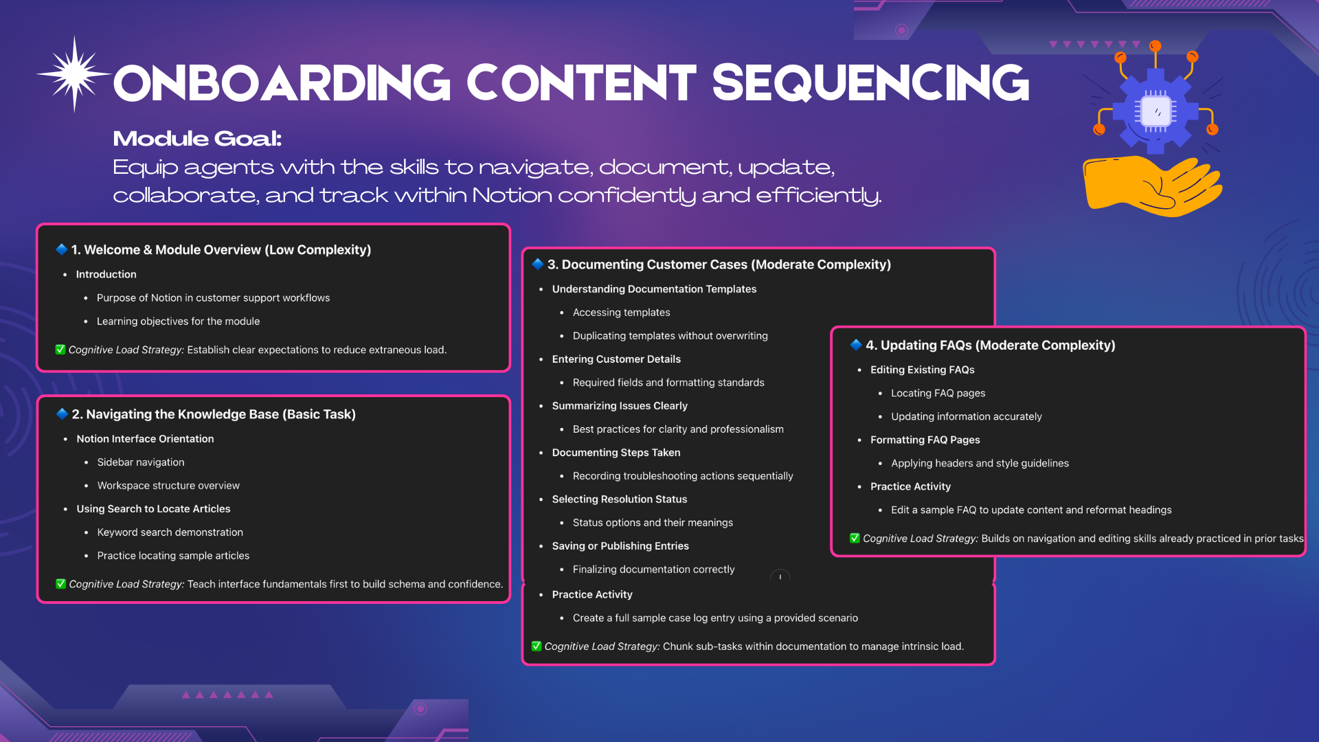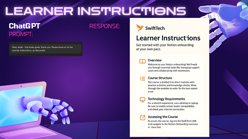 Integrate AI into the design process for an onboarding module grounded in instructional theory and performance-based objectives.