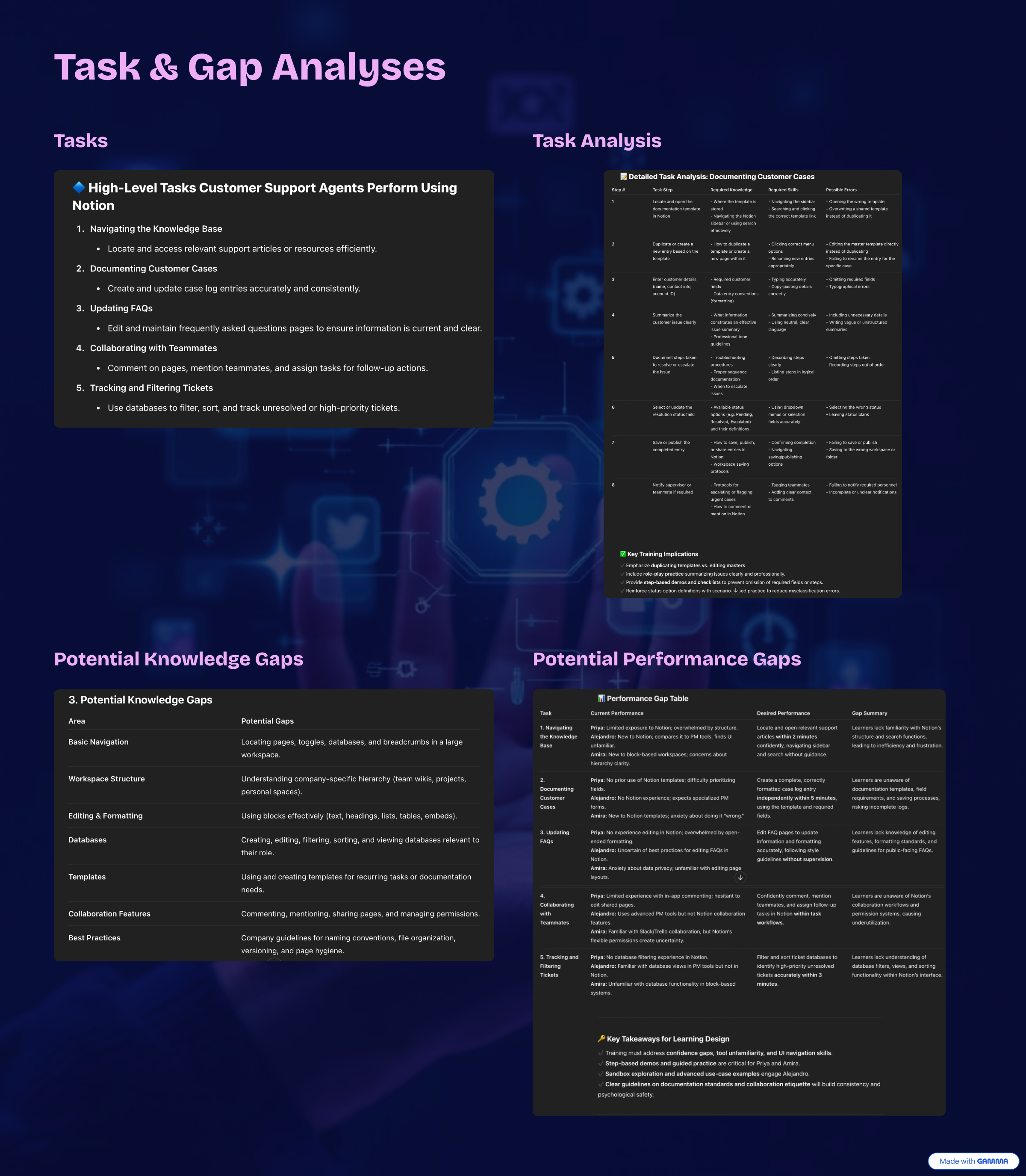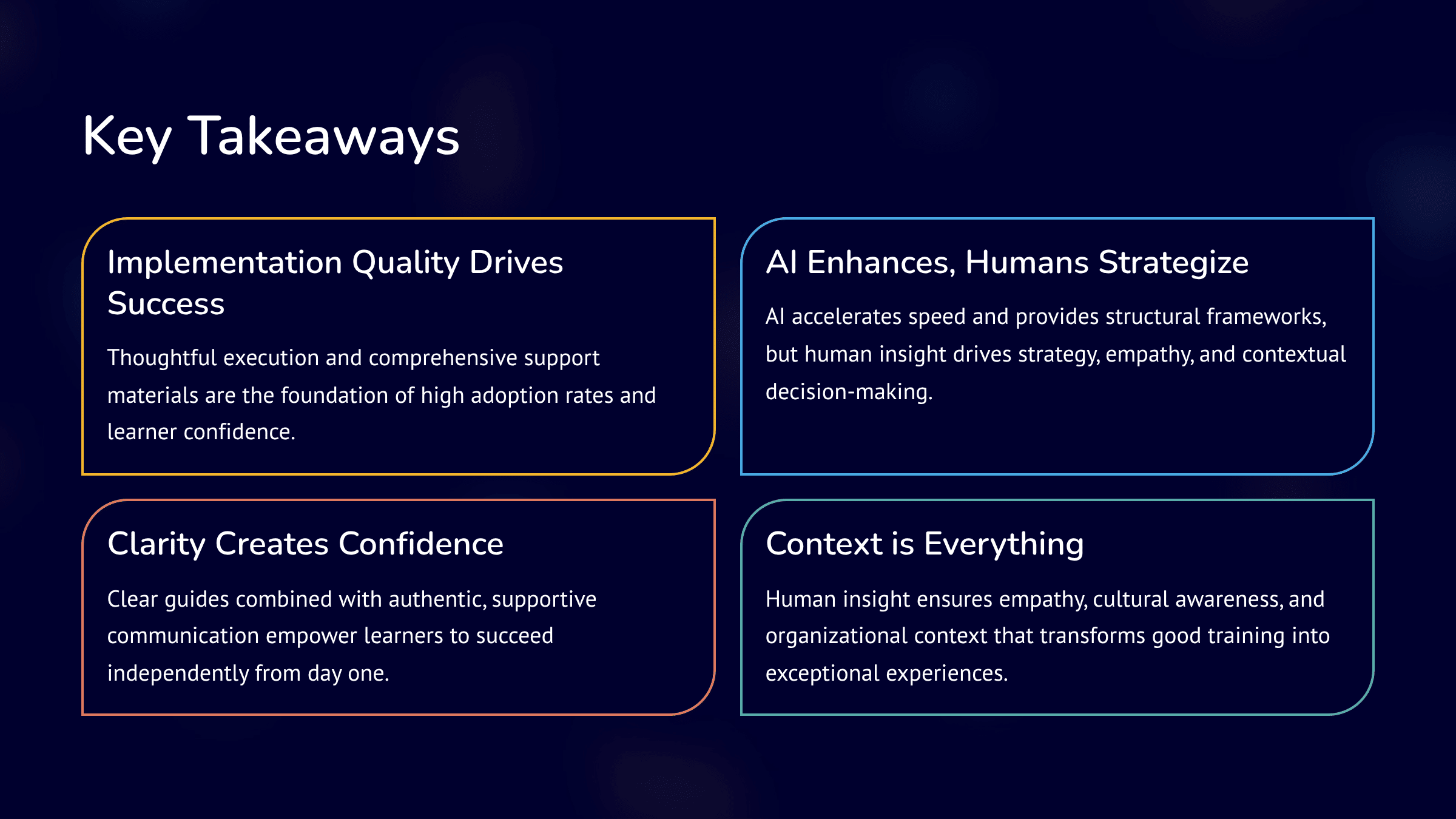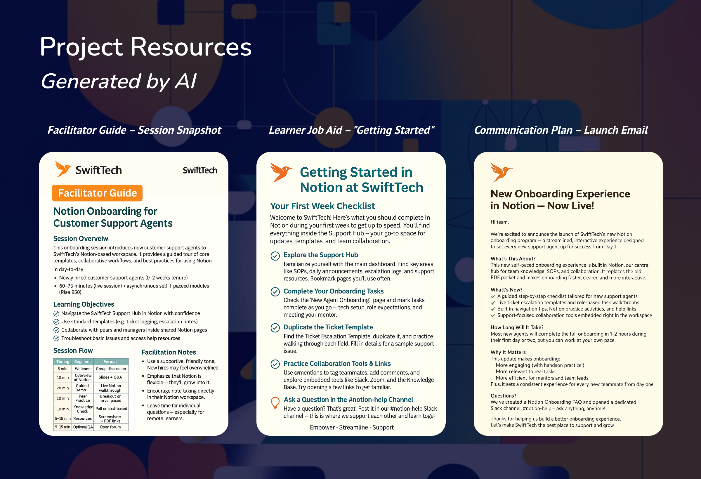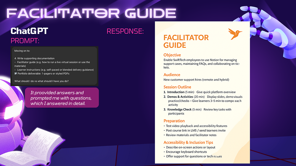 AI-generated drafts for facilitator guides, learner job aids, and resource checklists, later refined for brand alignment and clarity.
