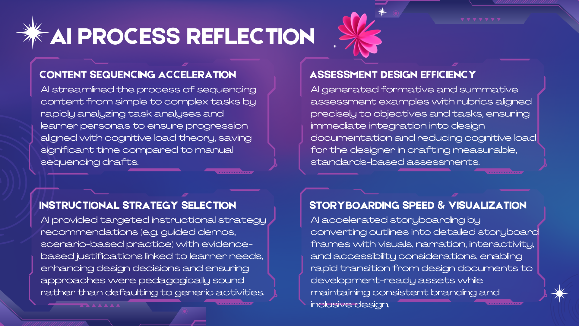 Use AI to optimize logical content sequencing, select instructional strategy selection, assessment planning, media and modality selection, and storyboard development.