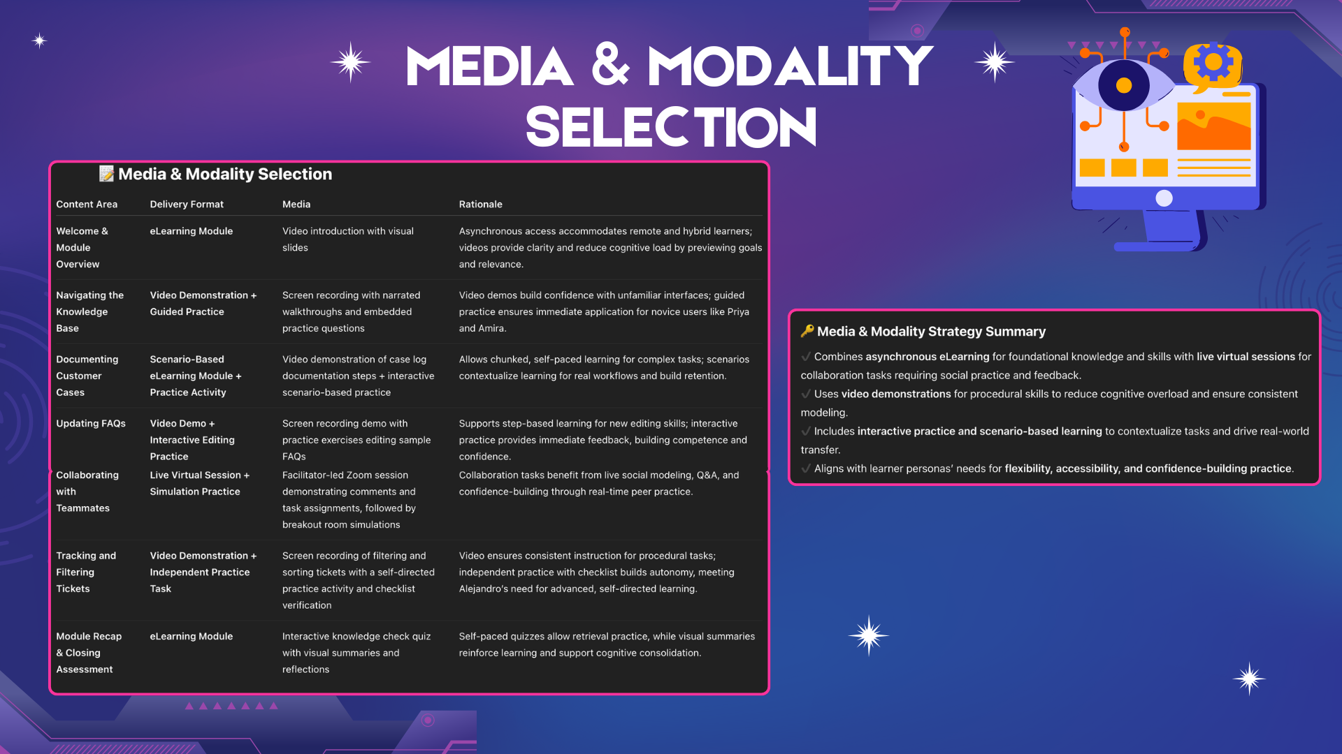 Decide delivery formats (eLearning, video demos, live virtual sessions) with rationale based on learner needs.