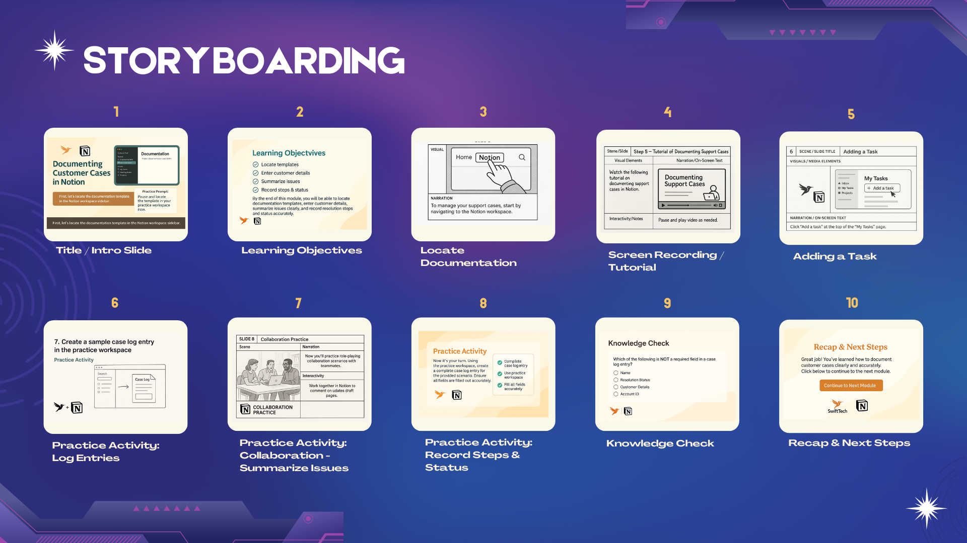 Develop a storyboard for one module or video, including visuals, narration, interactivity, and accessibility considerations.