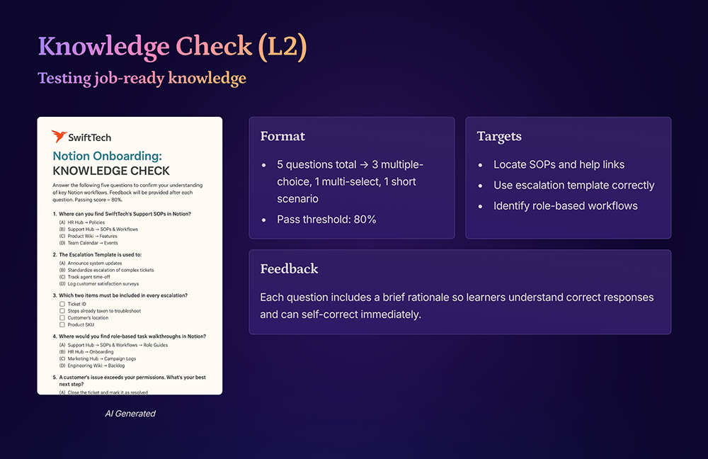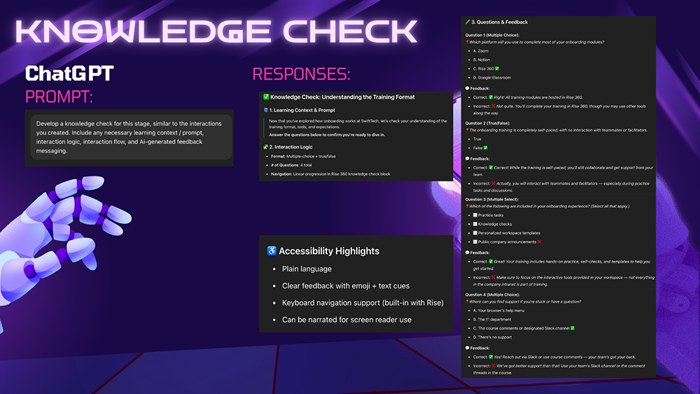Develop content- and platform-specific knowledge checks, including AI-generated feedback messaging.