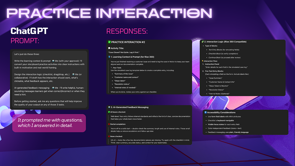 Use AI to optimize visual and video media development, build interactive practice activities / knowledge checks, and write support documentation.