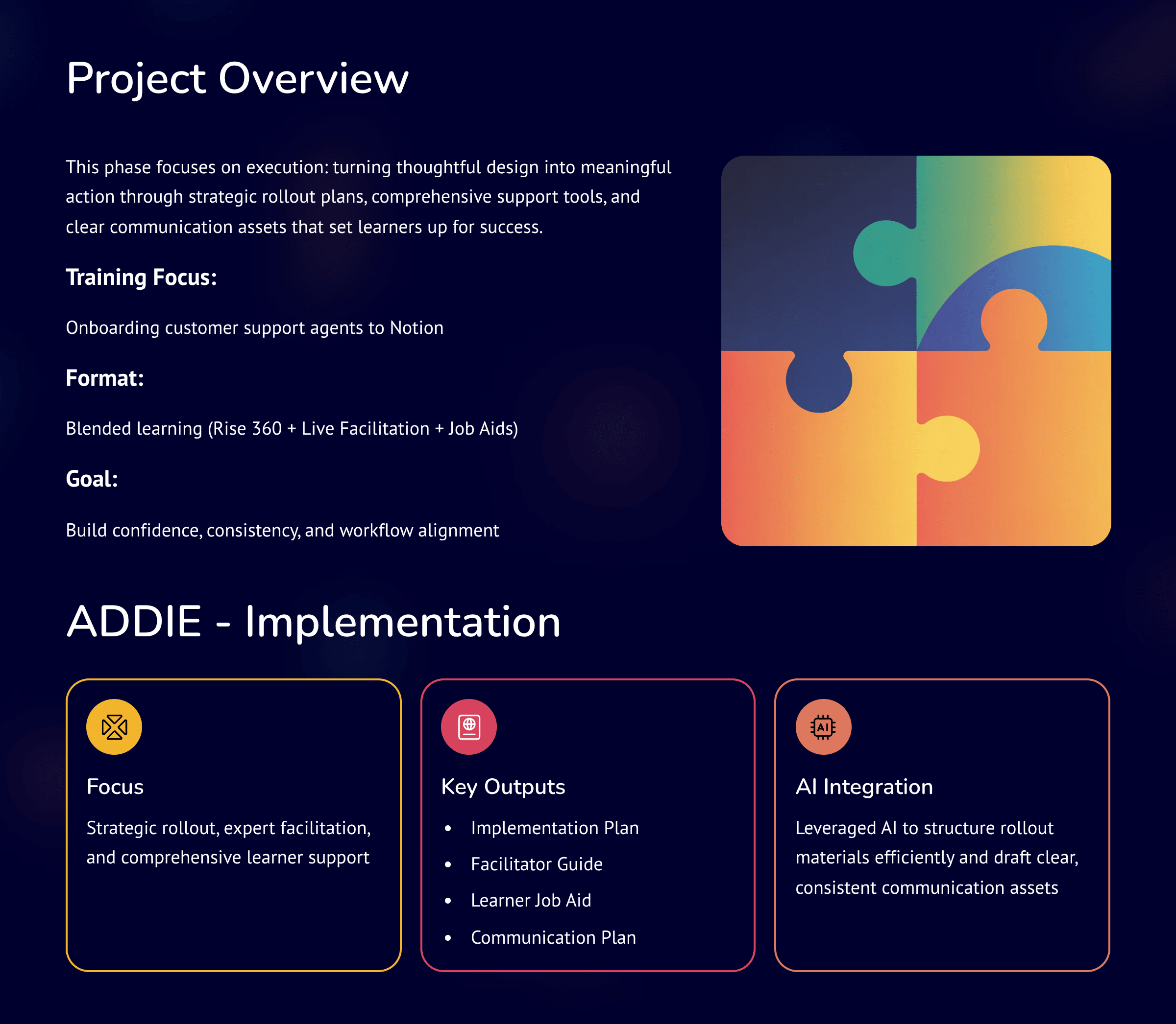 Use AI to create detailed implementation plans, design facilitator guides and learner job aids, and draft internal communication materials for launch. Integrate automation for scheduling, learner follow-ups, and feedback collection to ensure a smooth, scalable rollout experience.
