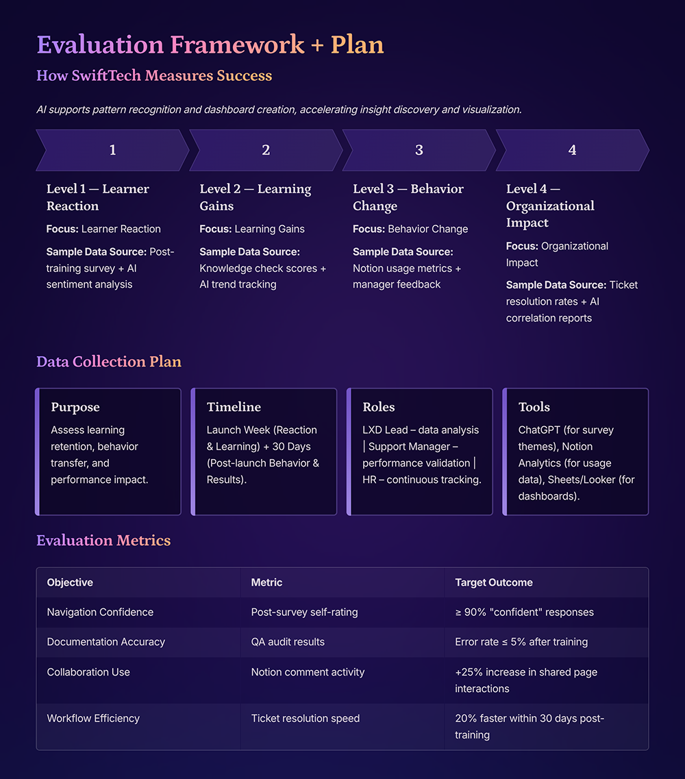 Design and document an evaluation plan incorporating Kirkpatrick Levels 1–4. Apply AI to analyze learning data, visualize performance trends, and generate actionable insights that inform program iteration.