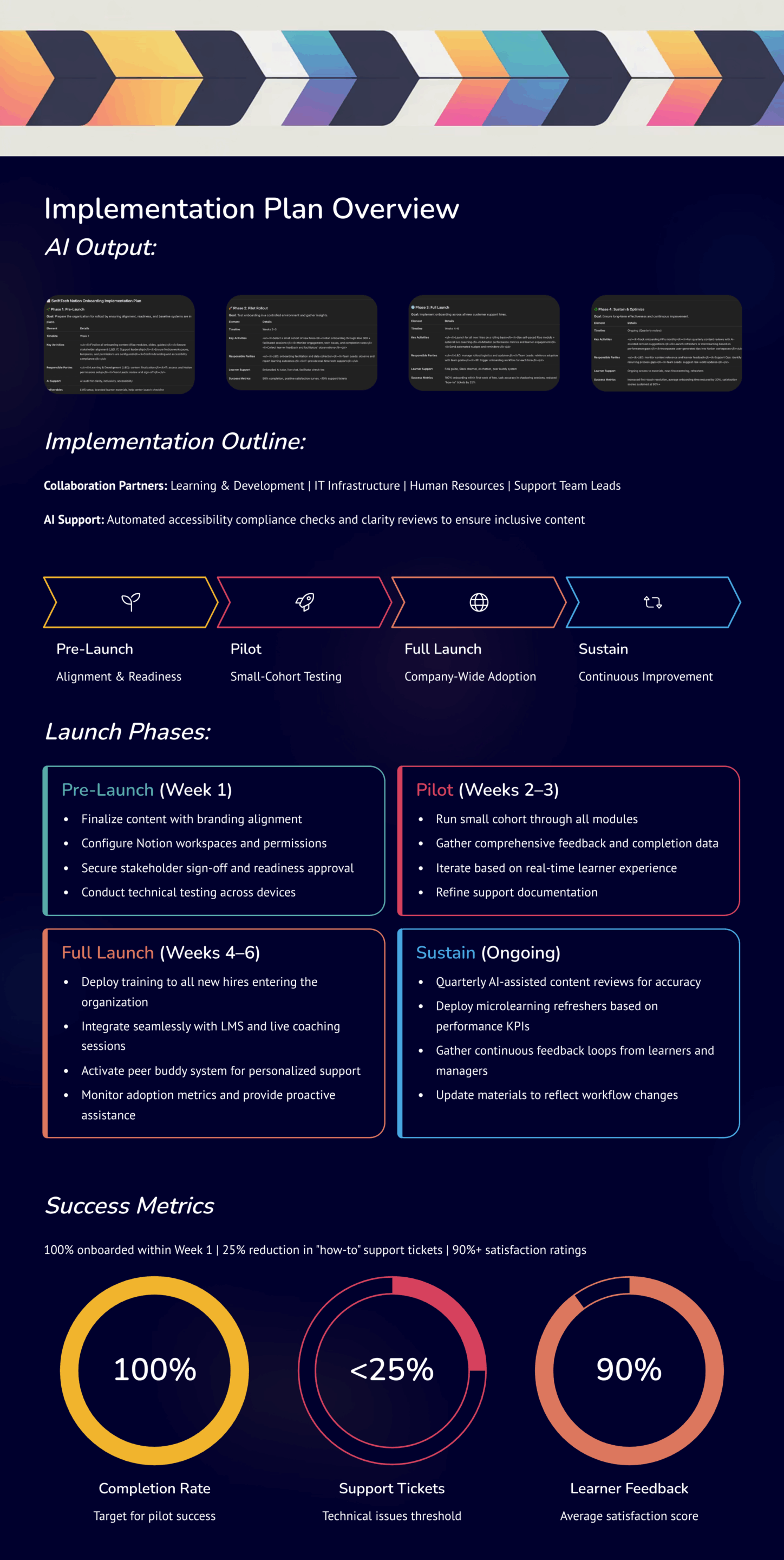 AI-assisted development of rollout frameworks, timelines, and stakeholder roles to ensure organized and efficient onboarding delivery.