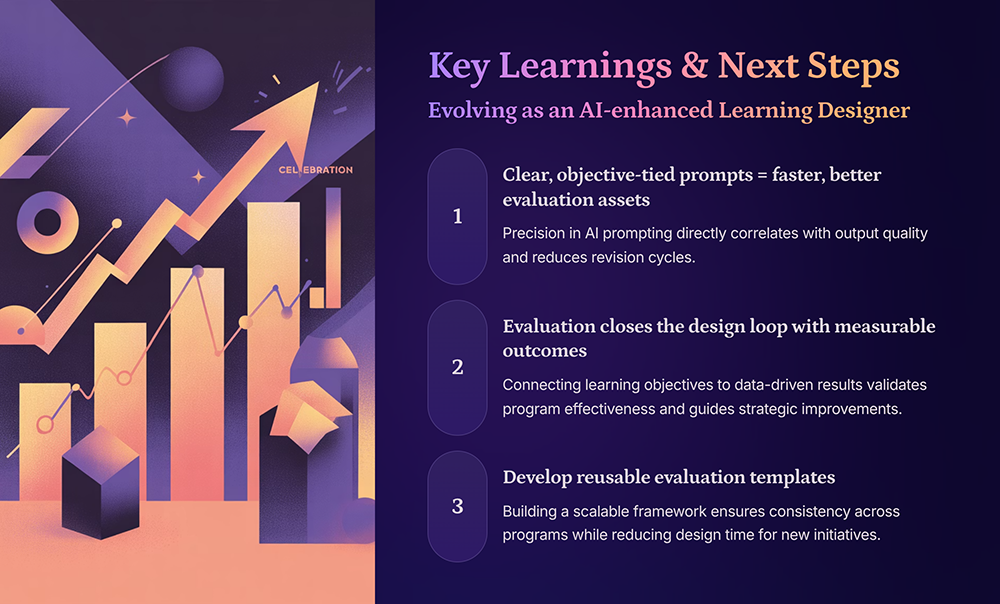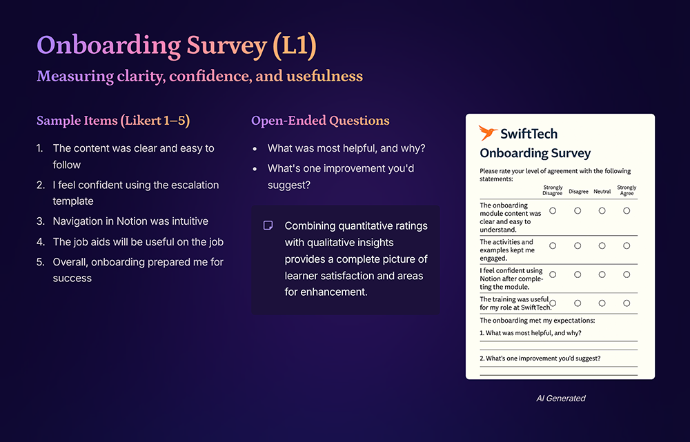 AI-assisted creation of surveys, knowledge checks, and an evaluation plan to measure learner reaction and learning outcomes using Kirkpatrick Levels 1–2.