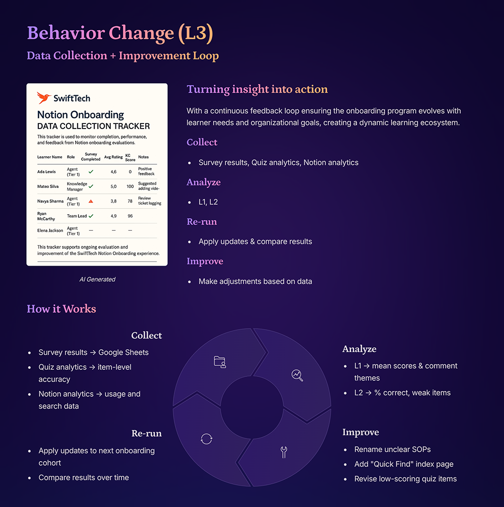 Created a data tracker to record completion rates, average scores, and feedback trends for ongoing performance monitoring.