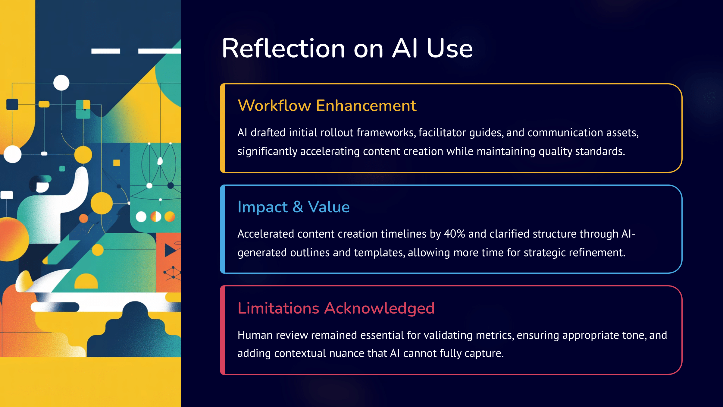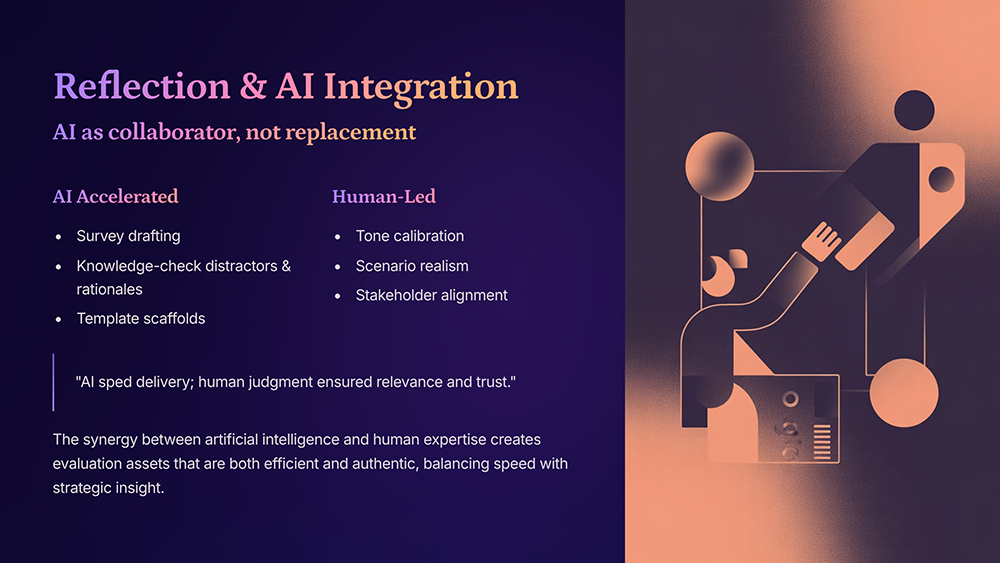 Documented how AI supported evaluation design and data workflows, highlighting where human insight added context and quality.
